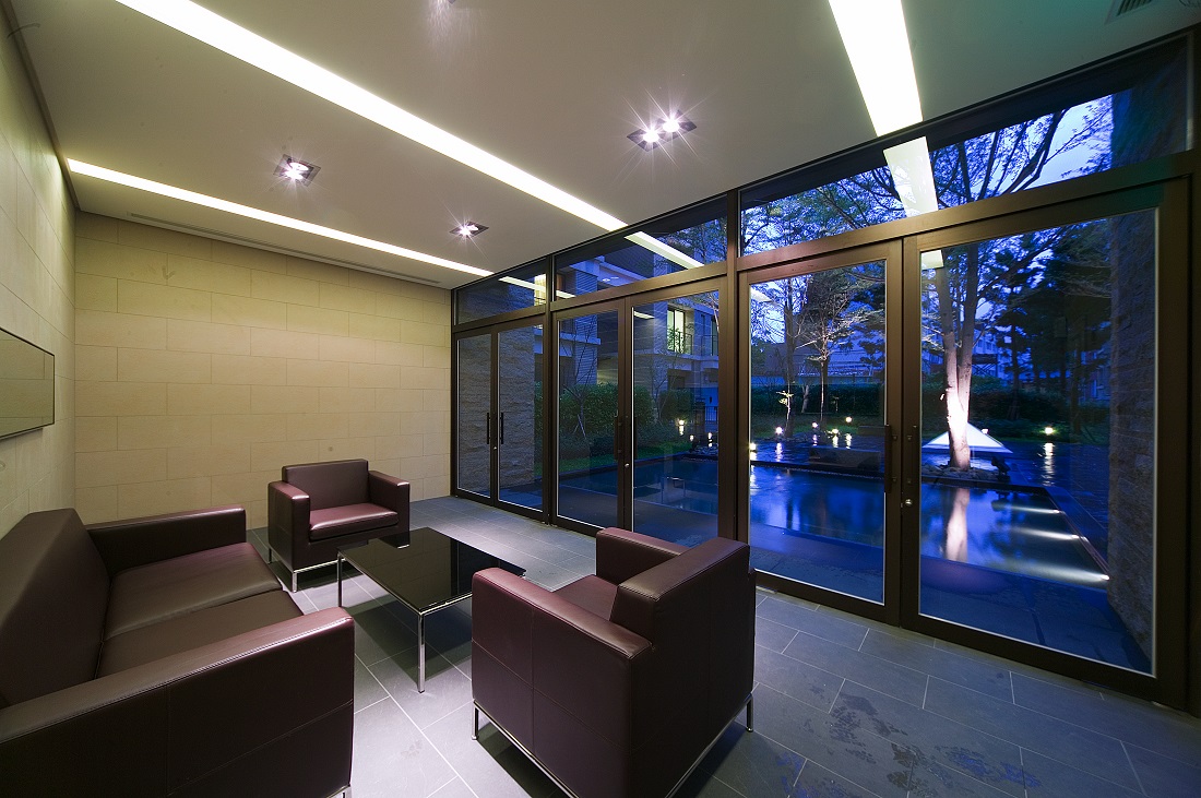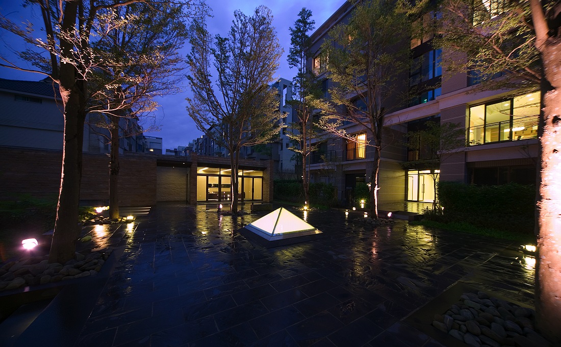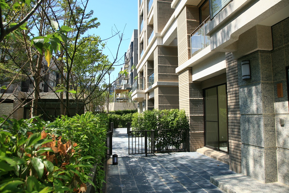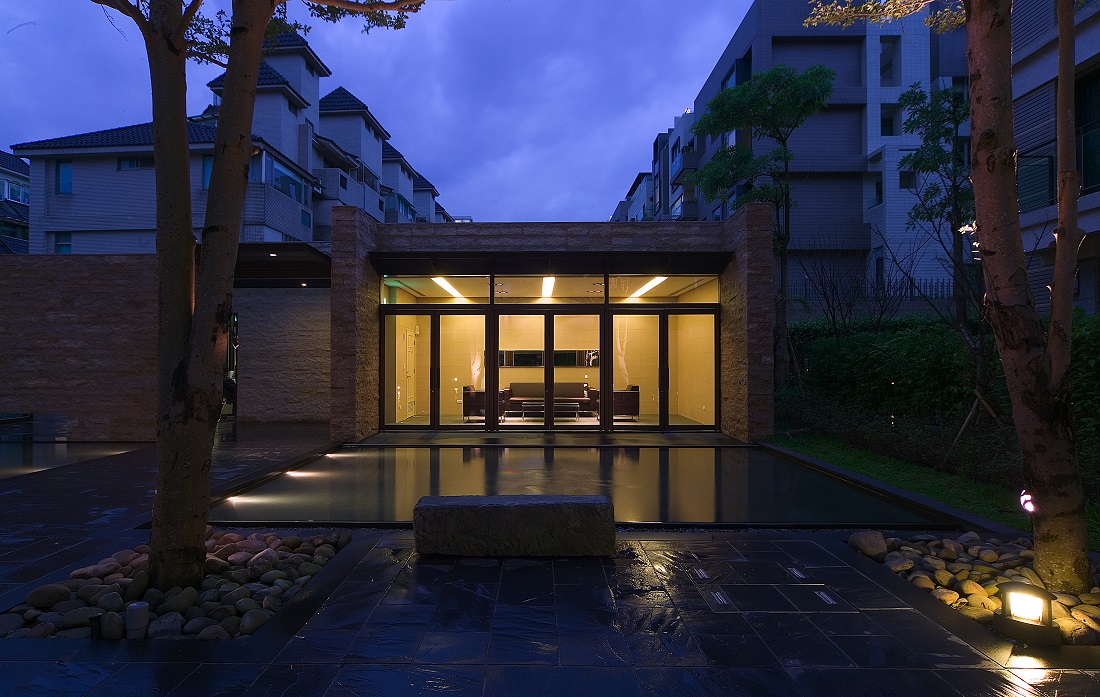 社區入口因面路衝,所以特別設計警衛崗哨結合社區圍牆及社區活動中心,成為單獨一棟一層樓的多功能建築體,住戶在接近家的途中輾轉穿越該建物,經過空間的轉換,接著經過中庭水池及中庭花園樹林的洗禮,再回到自己的天地,一連串刻意的安排,無非是讓住戶體驗回家的感受,是別於一般都市生活的步驟,定義出雅璞要求的居住品質。